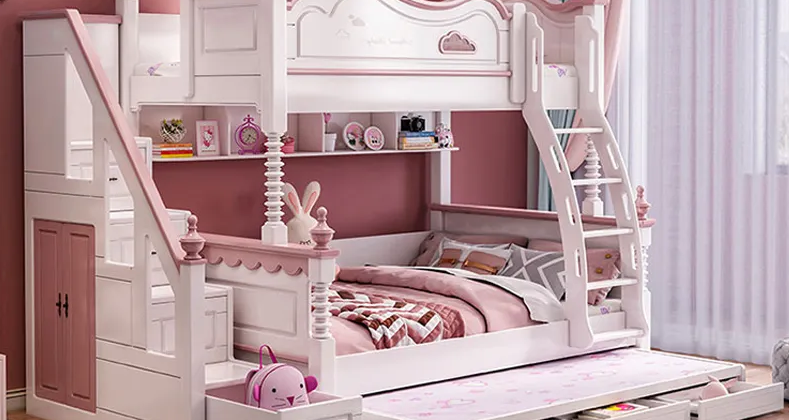 Ahşap kombine kızlar için çocuk odası ranzası! Altı çekmeli bazalı